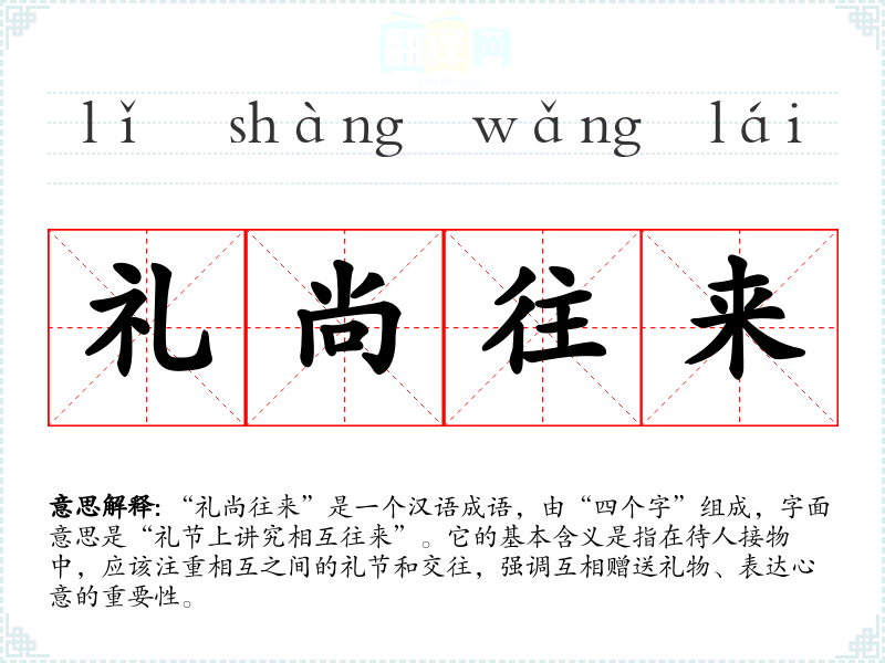 “礼尚往来”是一个汉语成语,由“四个字”组成,字面意思是“礼节上讲究相互往来”。它的基本含义是指在待人接物中,应该注重相互之间的礼节和交往,强调互相赠送礼物、表达心意的重要性。