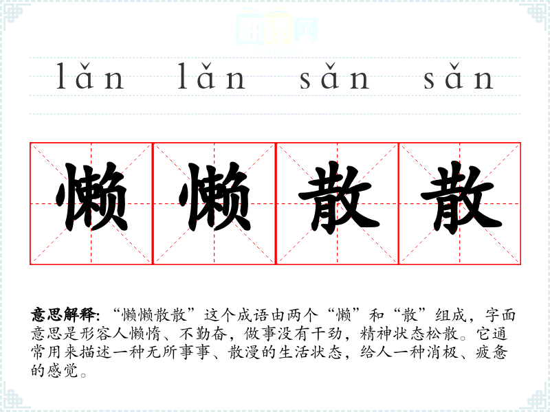 “懒懒散散”这个成语由两个“懒”和“散”组成,字面意思是形容人懒惰、不勤奋,做事没有干劲,精神状态松散。它通常用来描述一种无所事事、散漫的生活状态,给人一种消极、疲惫的感觉。