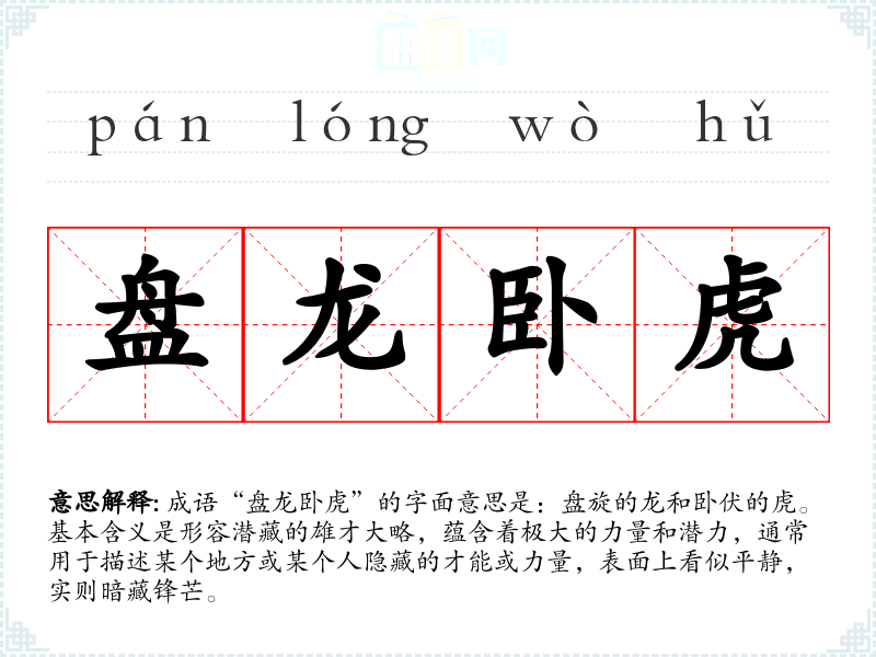 成语“盘龙卧虎”的字面意思是:盘旋的龙和卧伏的虎。基本含义是形容潜藏的雄才大略,蕴含着极大的力量和潜力,通常用于描述某个地方或某个人隐藏的才能或力量,表面上看似平静,实则暗藏锋芒。