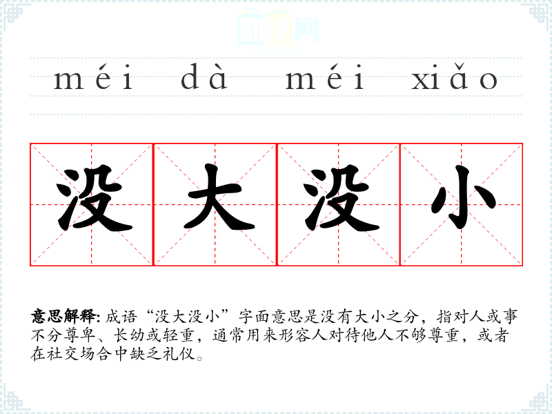 成语“没大没小”字面意思是没有大小之分,指对人或事不分尊卑、长幼或轻重,通常用来形容人对待他人不够尊重,或者在社交场合中缺乏礼仪。