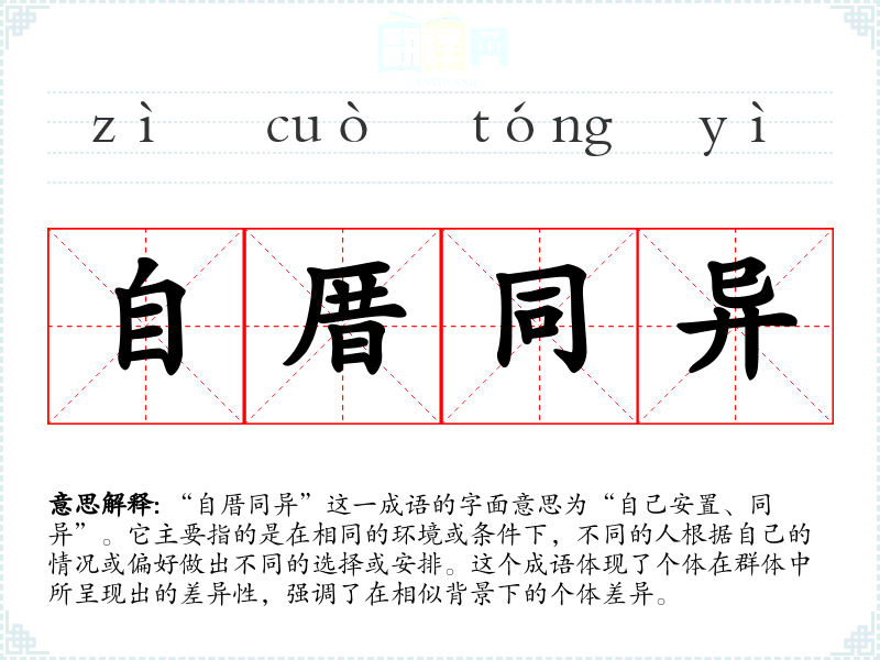 “自厝同异”这一成语的字面意思为“自己安置、同异”。它主要指的是在相同的环境或条件下,不同的人根据自己的情况或偏好做出不同的选择或安排。这个成语体现了个体在群体中所呈现出的差异性,强调了在相似背景下的个体差异。