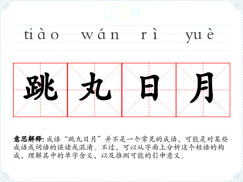 成语“跳丸日月”并不是一个常见的成语,可能是对某些成语或词语的误读或混淆。不过,可以从字面上分析这个短语的构成,理解其中的单字含义,以及推测可能的引申意义。