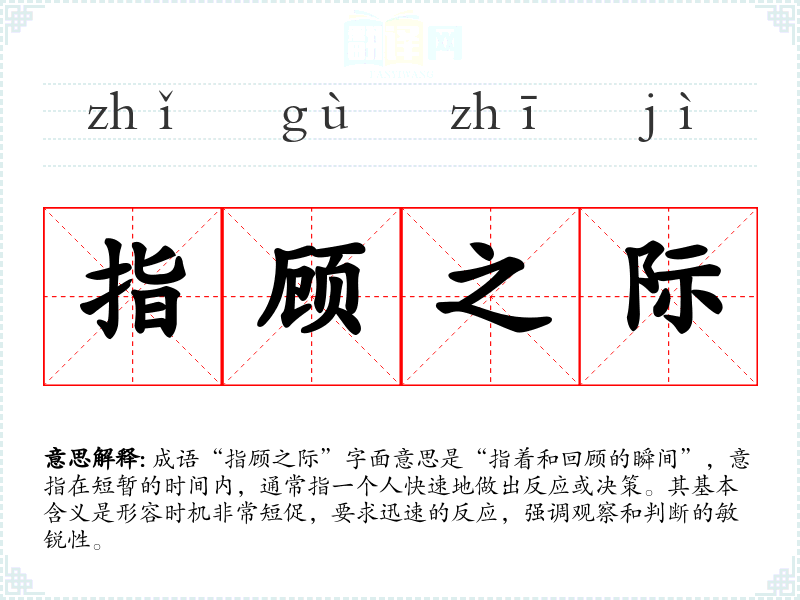 成语“指顾之际”字面意思是“指着和回顾的瞬间”,意指在短暂的时间内,通常指一个人快速地做出反应或决策。其基本含义是形容时机非常短促,要求迅速的反应,强调观察和判断的敏锐性。