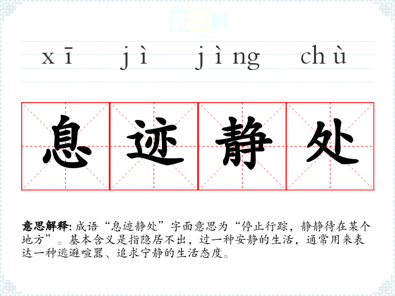 成语“息迹静处”字面意思为“停止行踪,静静待在某个地方”。基本含义是指隐居不出,过一种安静的生活,通常用来表达一种逃避喧嚣、追求宁静的生活态度。