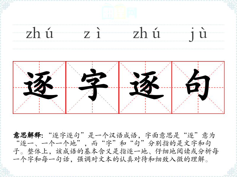 “逐字逐句”是一个汉语成语,字面意思是“逐”意为“逐一、一个一个地”,而“字”和“句”分别指的是文字和句子。整体上,该成语的基本含义是指逐一地、仔细地阅读或分析每一个字和每一句话,强调对文本的认真对待和细致入微的理解。