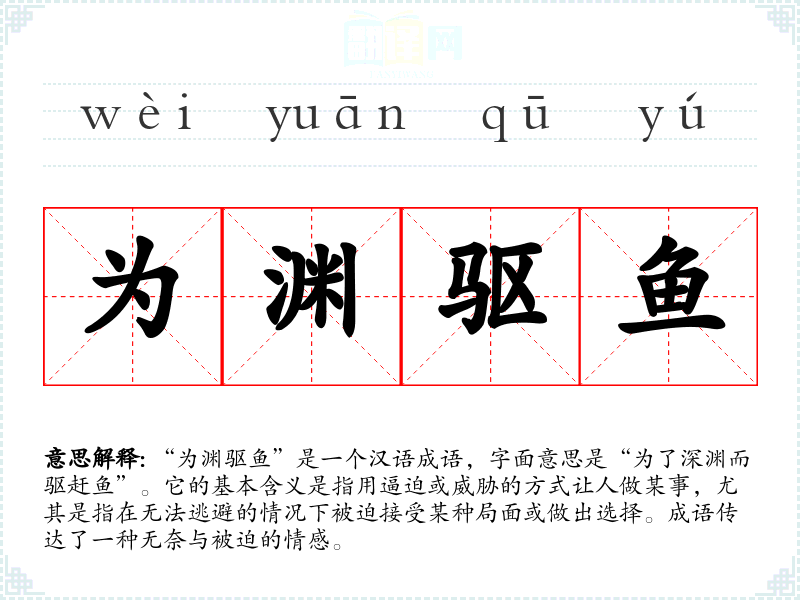 “为渊驱鱼”是一个汉语成语,字面意思是“为了深渊而驱赶鱼”。它的基本含义是指用逼迫或威胁的方式让人做某事,尤其是指在无法逃避的情况下被迫接受某种局面或做出选择。成语传达了一种无奈与被迫的情感。
