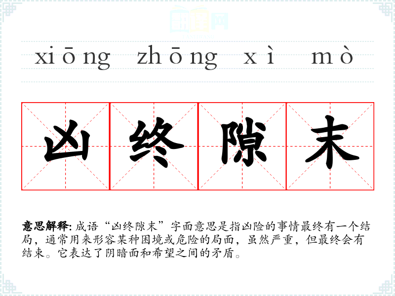 成语“凶终隙末”字面意思是指凶险的事情最终有一个结局,通常用来形容某种困境或危险的局面,虽然严重,但最终会有结束。它表达了阴暗面和希望之间的矛盾。