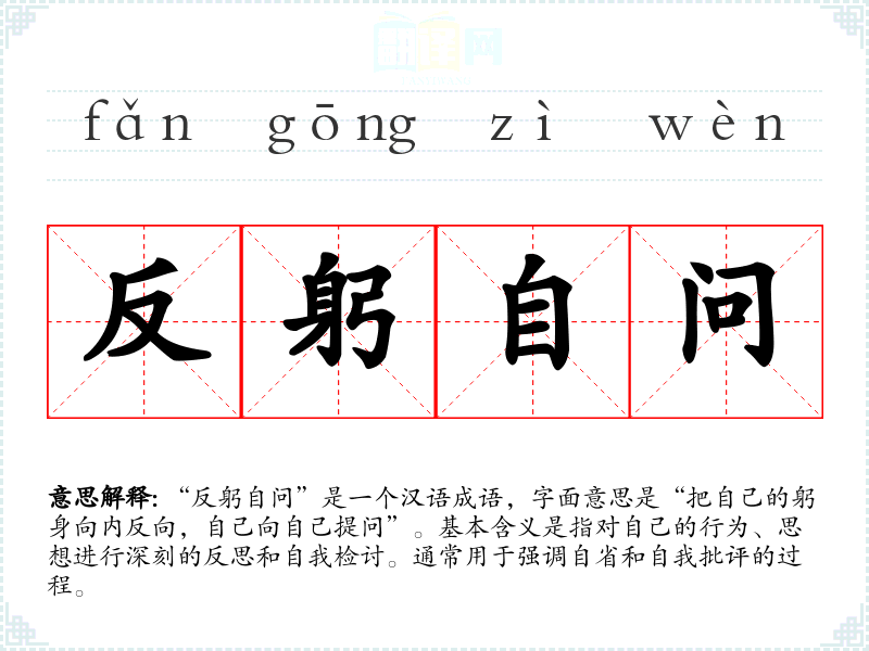 “反躬自问”是一个汉语成语,字面意思是“把自己的躬身向内反向,自己向自己提问”。基本含义是指对自己的行为、思想进行深刻的反思和自我检讨。通常用于强调自省和自我批评的过程。