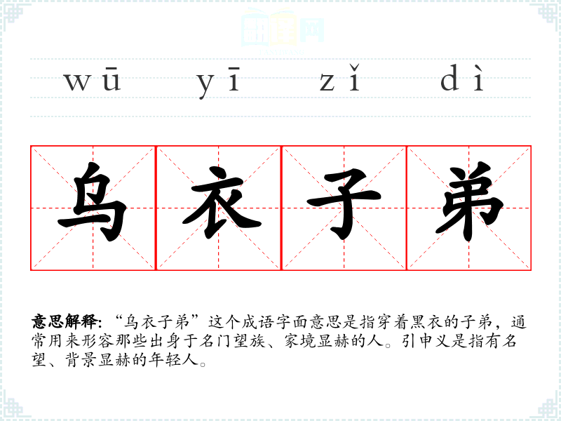 “乌衣子弟”这个成语字面意思是指穿着黑衣的子弟,通常用来形容那些出身于名门望族、家境显赫的人。引申义是指有名望、背景显赫的年轻人。