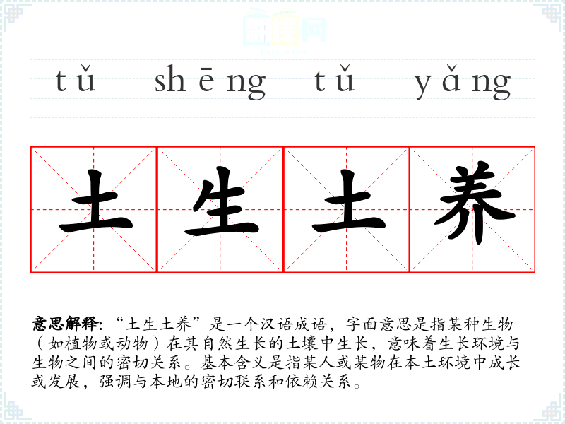 “土生土养”是一个汉语成语,字面意思是指某种生物(如植物或动物)在其自然生长的土壤中生长,意味着生长环境与生物之间的密切关系。基本含义是指某人或某物在本土环境中成长或发展,强调与本地的密切联系和依赖关系。