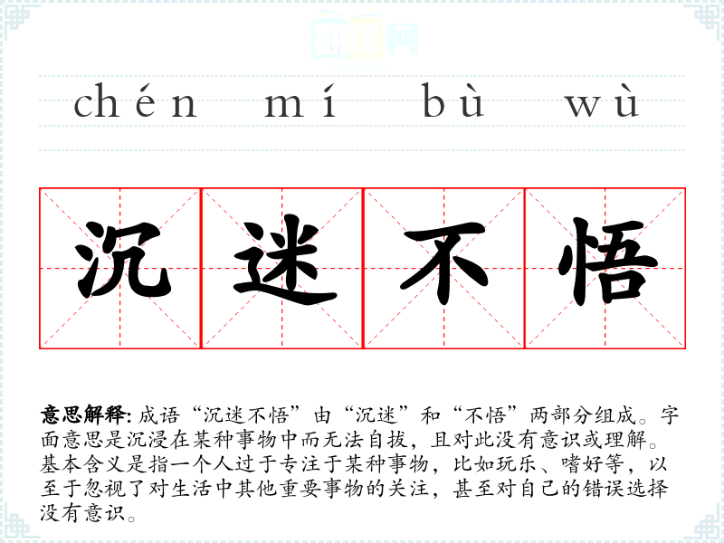 成语“沉迷不悟”由“沉迷”和“不悟”两部分组成。字面意思是沉浸在某种事物中而无法自拔,且对此没有意识或理解。基本含义是指一个人过于专注于某种事物,比如玩乐、嗜好等,以至于忽视了对生活中其他重要事物的关注,甚至对自己的错误选择没有意识。