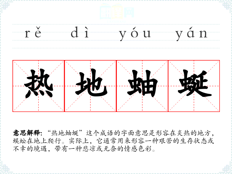“热地蚰蜒”这个成语的字面意思是形容在炎热的地方,蜈蚣在地上爬行。实际上,它通常用来形容一种艰苦的生存状态或不幸的境遇,带有一种悲凉或无奈的情感色彩。