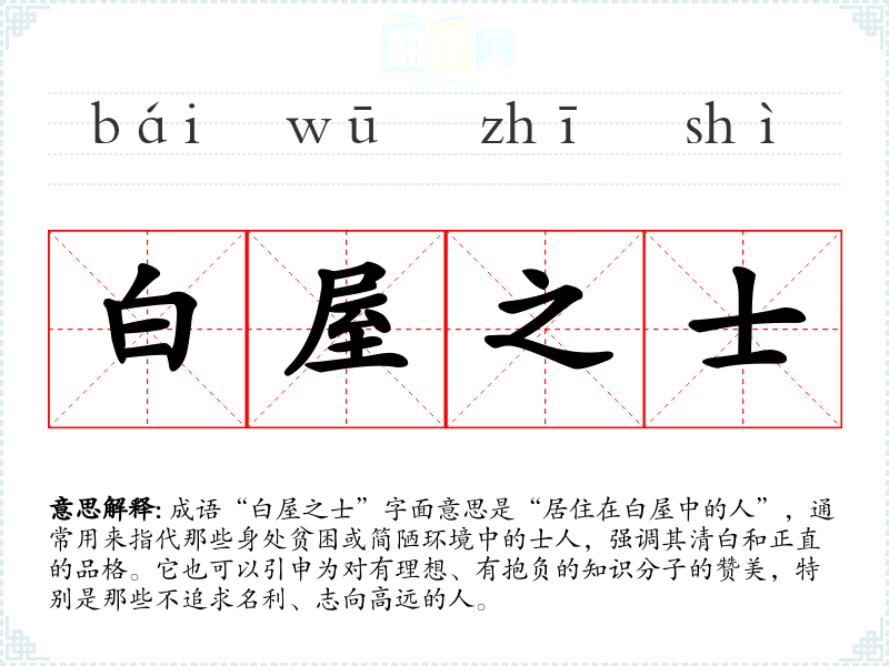 成语“白屋之士”字面意思是“居住在白屋中的人”,通常用来指代那些身处贫困或简陋环境中的士人,强调其清白和正直的品格。它也可以引申为对有理想、有抱负的知识分子的赞美,特别是那些不追求名利、志向高远的人。