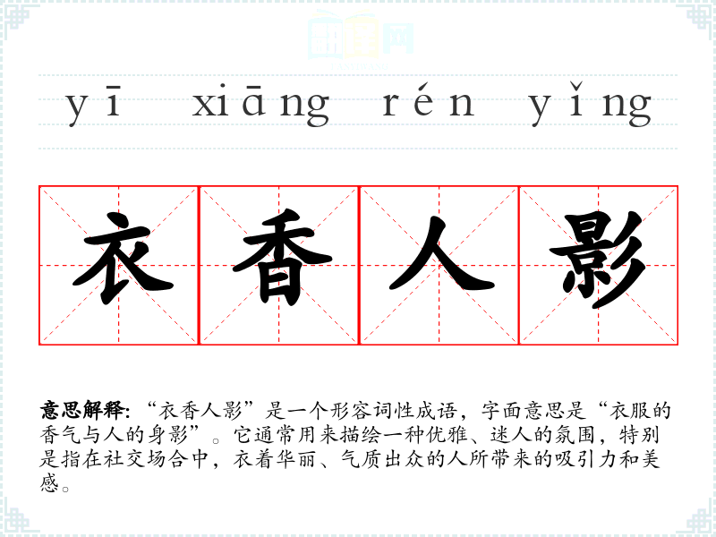 “衣香人影”是一个形容词性成语,字面意思是“衣服的香气与人的身影”。它通常用来描绘一种优雅、迷人的氛围,特别是指在社交场合中,衣着华丽、气质出众的人所带来的吸引力和美感。