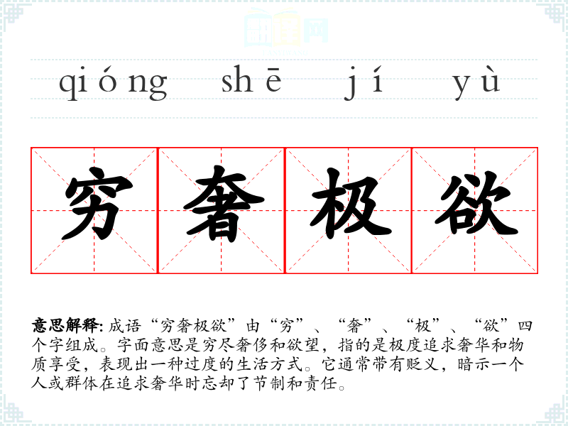 成语“穷奢极欲”由“穷”、“奢”、“极”、“欲”四个字组成。字面意思是穷尽奢侈和欲望,指的是极度追求奢华和物质享受,表现出一种过度的生活方式。它通常带有贬义,暗示一个人或群体在追求奢华时忘却了节制和责任。