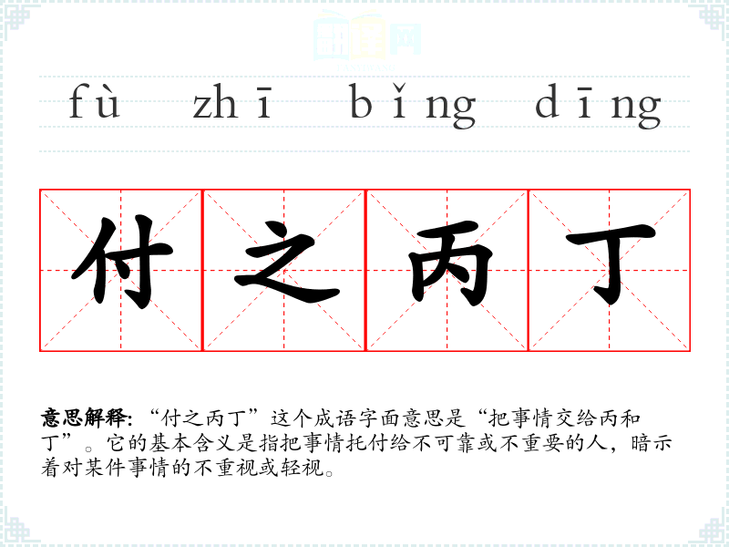“付之丙丁”这个成语字面意思是“把事情交给丙和丁”。它的基本含义是指把事情托付给不可靠或不重要的人,暗示着对某件事情的不重视或轻视。