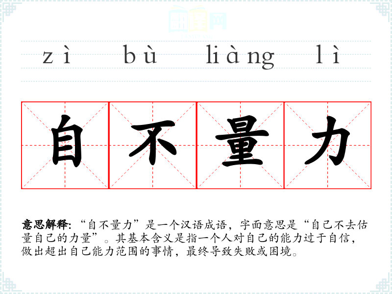 “自不量力”是一个汉语成语,字面意思是“自己不去估量自己的力量”。其基本含义是指一个人对自己的能力过于自信,做出超出自己能力范围的事情,最终导致失败或困境。