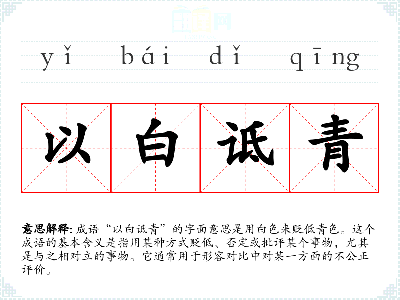 成语“以白诋青”的字面意思是用白色来贬低青色。这个成语的基本含义是指用某种方式贬低、否定或批评某个事物,尤其是与之相对立的事物。它通常用于形容对比中对某一方面的不公正评价。