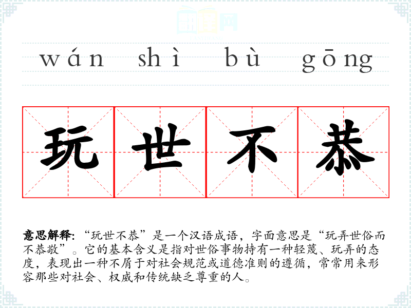 “玩世不恭”是一个汉语成语,字面意思是“玩弄世俗而不恭敬”。它的基本含义是指对世俗事物持有一种轻蔑、玩弄的态度,表现出一种不屑于对社会规范或道德准则的遵循,常常用来形容那些对社会、权威和传统缺乏尊重的人。
