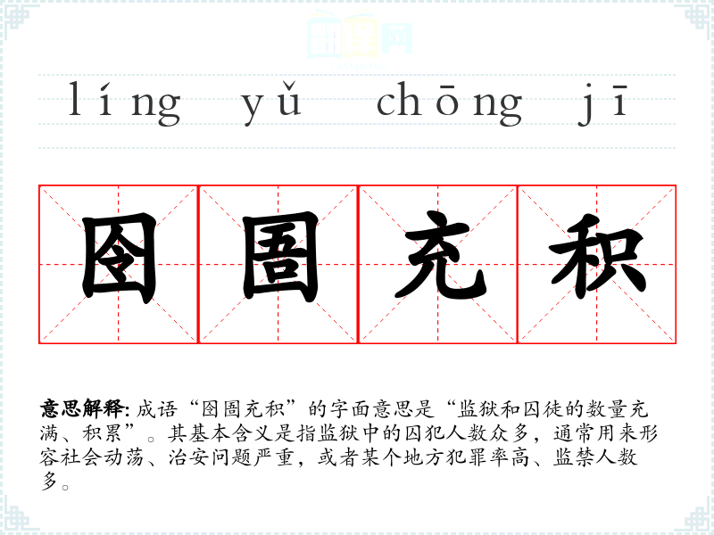“囹圄充积”出自古代对监狱的描述,虽然没有明确的文学出处,但可以联想到历史上关于监狱和囚犯数量的记载。囹圄是指监狱,充积则表示数量的增加。这一成语反映了历史上对社会治安和法律秩序的关注。