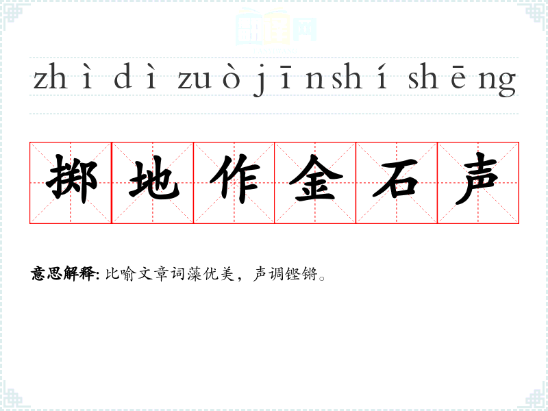 | 掷地作金石声 | 比喻文章词藻优美,声调铿锵。 |