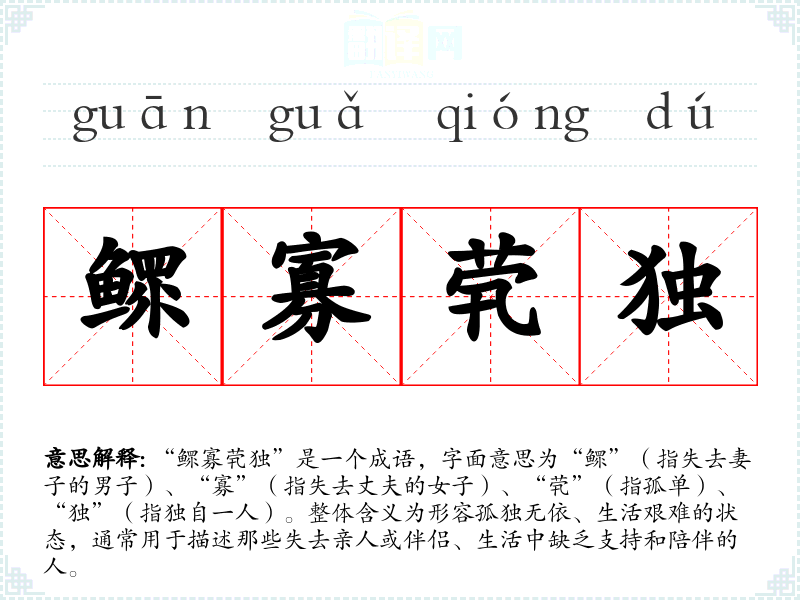 “鳏寡茕独”是一个成语,字面意思为“鳏”(指失去妻子的男子)、“寡”(指失去丈夫的女子)、“茕”(指孤单)、“独”(指独自一人)。整体含义为形容孤独无依、生活艰难的状态,通常用于描述那些失去亲人或伴侣、生活中缺乏支持和陪伴的人。