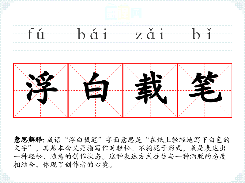成语“浮白载笔”字面意思是“在纸上轻轻地写下白色的文字”,其基本含义是指写作时轻松、不拘泥于形式,或是表达出一种轻松、随意的创作状态。这种表达方式往往与一种洒脱的态度相结合,体现了创作者的心境。