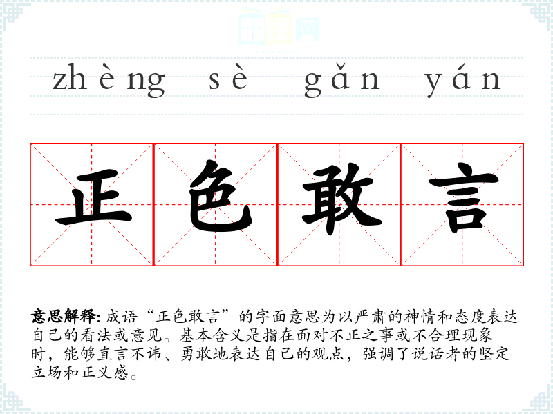 成语“正色敢言”的字面意思为以严肃的神情和态度表达自己的看法或意见。基本含义是指在面对不正之事或不合理现象时,能够直言不讳、勇敢地表达自己的观点,强调了说话者的坚定立场和正义感。