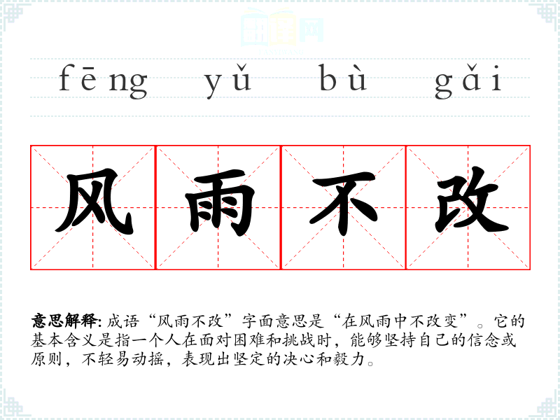 成语“风雨不改”字面意思是“在风雨中不改变”。它的基本含义是指一个人在面对困难和挑战时,能够坚持自己的信念或原则,不轻易动摇,表现出坚定的决心和毅力。