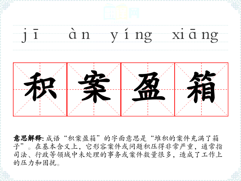 成语“积案盈箱”的字面意思是“堆积的案件充满了箱子”。在基本含义上,它形容案件或问题积压得非常严重,通常指司法、行政等领域中未处理的事务或案件数量很多,造成了工作上的压力和困扰。
