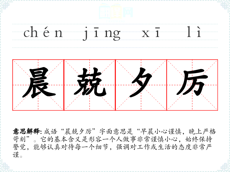 成语“晨兢夕厉”字面意思是“早晨小心谨慎,晚上严格苛刻”。它的基本含义是形容一个人做事非常谨慎小心,始终保持警觉,能够认真对待每一个细节,强调对工作或生活的态度非常严谨。