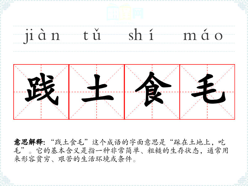 “践土食毛”这个成语的字面意思是“踩在土地上,吃毛”。它的基本含义是指一种非常简单、粗糙的生存状态,通常用来形容贫穷、艰苦的生活环境或条件。