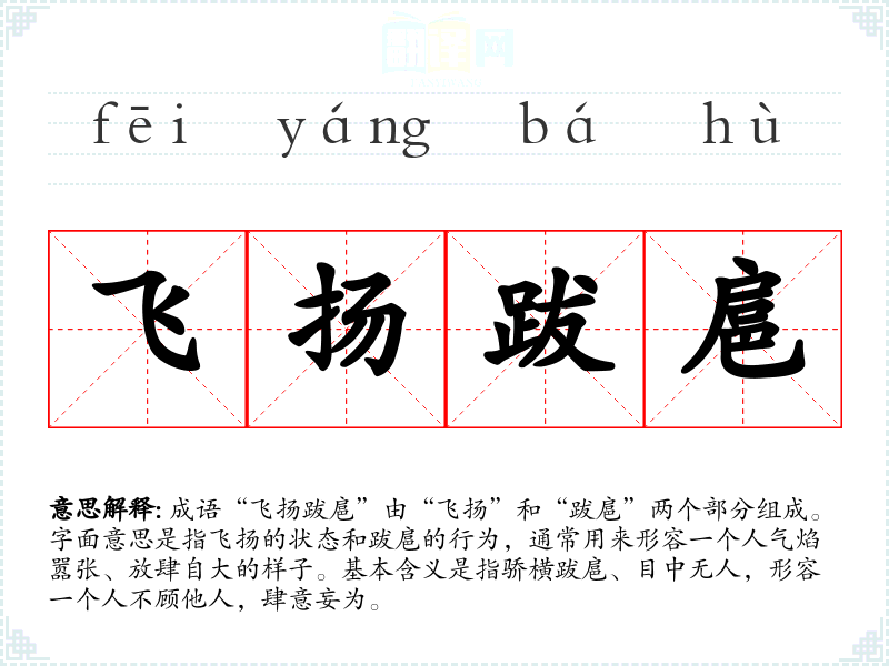 | 飞扬跋扈 | 飞扬:放纵;跋扈:蛮横。原指意态狂豪,不爱约束。现多形容骄横放肆,目中无人。 |