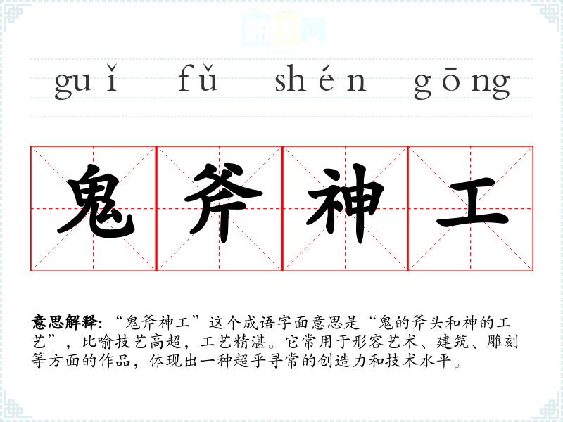 “鬼斧神工”这个成语字面意思是“鬼的斧头和神的工艺”,比喻技艺高超,工艺精湛。它常用于形容艺术、建筑、雕刻等方面的作品,体现出一种超乎寻常的创造力和技术水平。