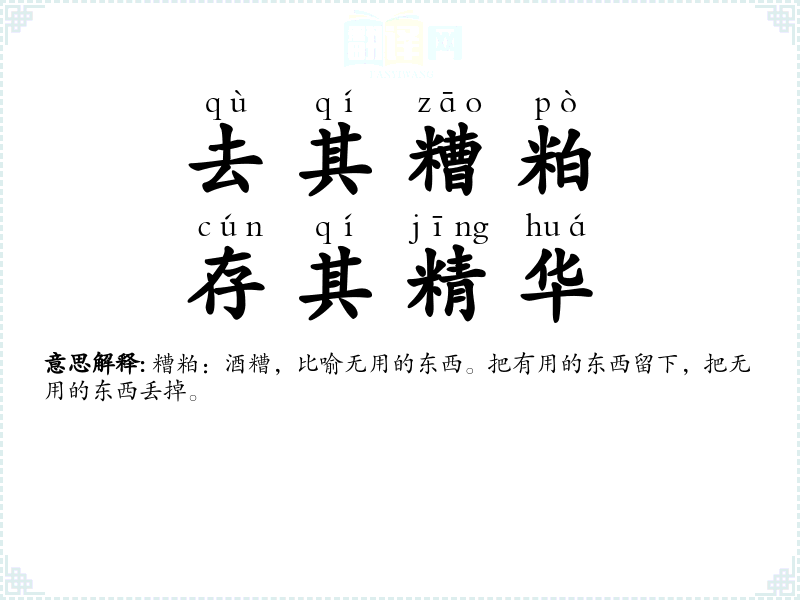 糟粕:酒糟,比喻无用的东西。把有用的东西留下,把无用的东西丢掉。 |
