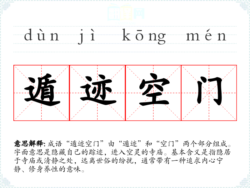 成语“遁迹空门”由“遁迹”和“空门”两个部分组成。字面意思是隐藏自己的踪迹,进入空灵的寺庙。基本含义是指隐居于寺庙或清静之处,远离世俗的纷扰,通常带有一种追求内心宁静、修身养性的意味。