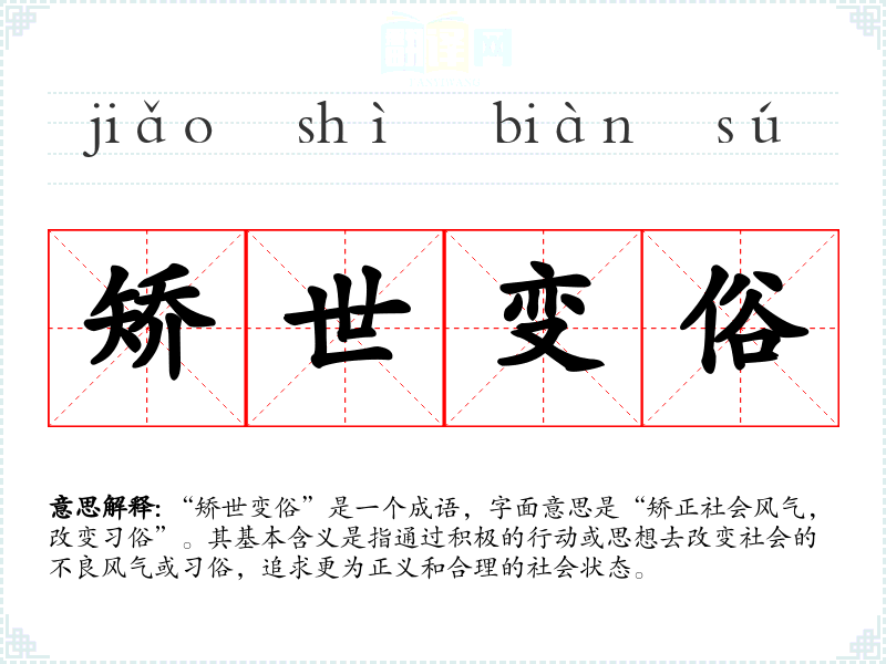 “矫世变俗”是一个成语,字面意思是“矫正社会风气,改变俗”。其基本含义是指通过积极的行动或思想去改变社会的不良风气或俗,追求更为正义和合理的社会状态。