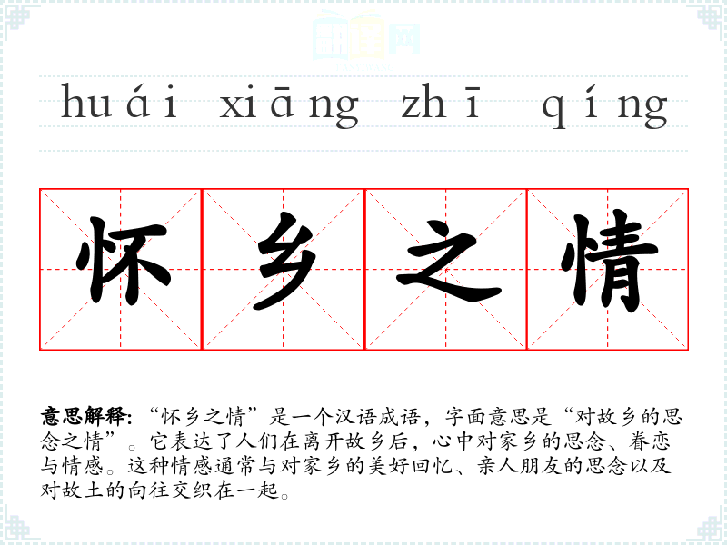 “怀乡之情”是一个汉语成语,字面意思是“对故乡的思念之情”。它表达了人们在离开故乡后,心中对家乡的思念、眷恋与情感。这种情感通常与对家乡的美好回忆、亲人朋友的思念以及对故土的向往交织在一起。