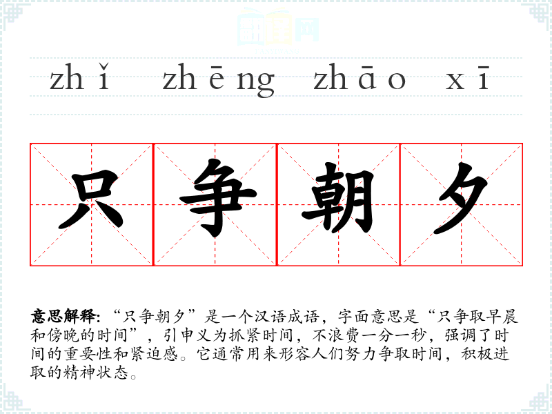 “只争朝夕”是一个汉语成语,字面意思是“只争取早晨和傍晚的时间”,引申义为抓紧时间,不浪费一分一秒,强调了时间的重要性和紧迫感。它通常用来形容人们努力争取时间,积极进取的精神状态。