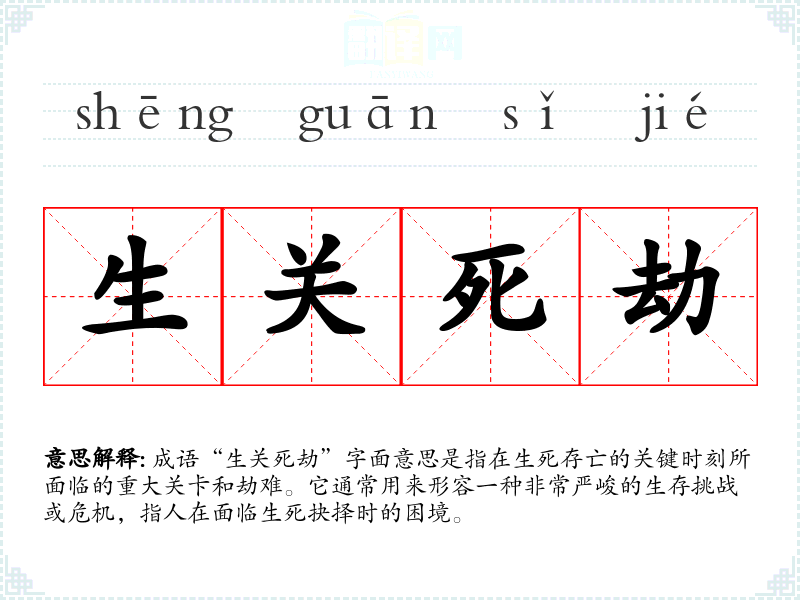成语“生关死劫”字面意思是指在生死存亡的关键时刻所面临的重大关卡和劫难。它通常用来形容一种非常严峻的生存挑战或危机,指人在面临生死抉择时的困境。