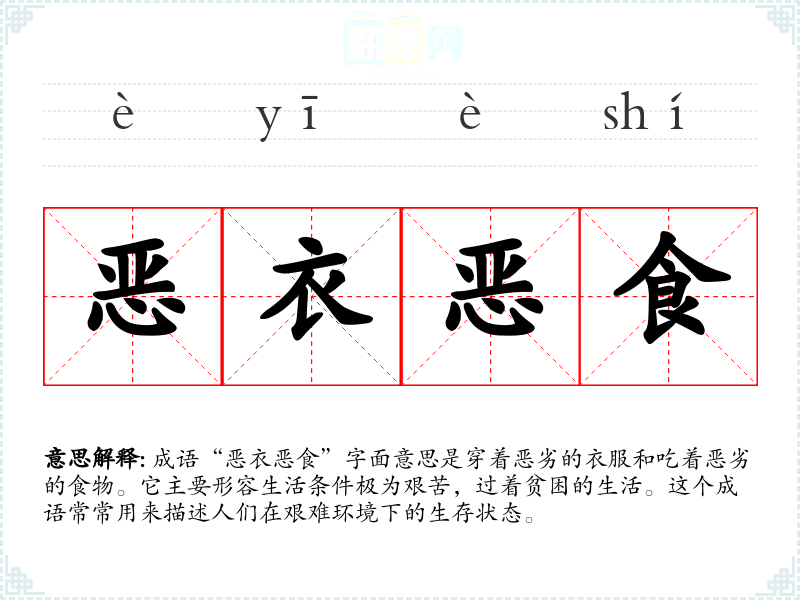 成语“恶衣恶食”字面意思是穿着恶劣的衣服和吃着恶劣的食物。它主要形容生活条件极为艰苦,过着贫困的生活。这个成语常常用来描述人们在艰难环境下的生存状态。
