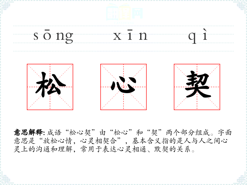 成语“松心契”由“松心”和“契”两个部分组成。字面意思是“放松心情,心灵相契合”,基本含义指的是人与人之间心灵上的沟通和理解,常用于表达心灵相通、默契的关系。
