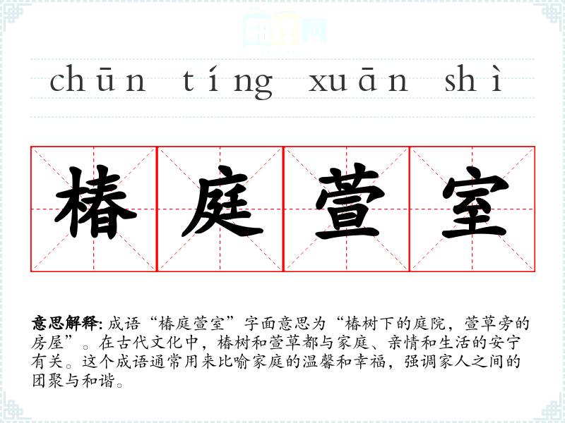 成语“椿庭萱室”字面意思为“椿树下的庭院,萱草旁的房屋”。在古代文化中,椿树和萱草都与家庭、亲情和生活的安宁有关。这个成语通常用来比喻家庭的温馨和幸福,强调家人之间的团聚与和谐。