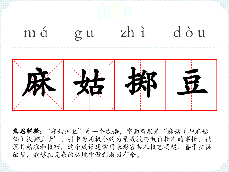 “麻姑掷豆”是一个成语,字面意思是“麻姑(即麻姑仙)投掷豆子”,引申为用极小的力量或技巧做出精准的事情,强调其精准和技巧。这个成语通常用来形容某人技艺高超,善于把握细节,能够在复杂的环境中做到游刃有余。