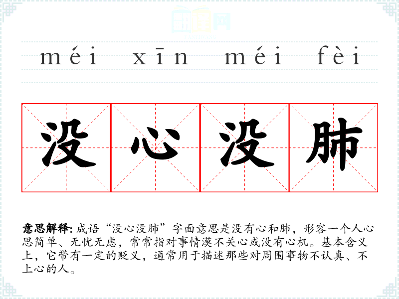 成语“没心没肺”字面意思是没有心和肺,形容一个人心思简单、无忧无虑,常常指对事情漠不关心或没有心机。基本含义上,它带有一定的贬义,通常用于描述那些对周围事物不认真、不上心的人。