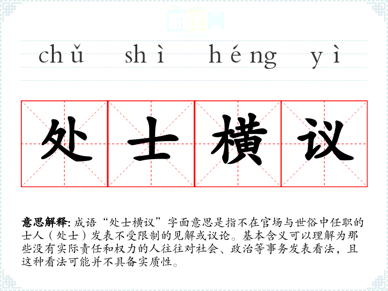 成语“处士横议”字面意思是指不在官场与世俗中任职的士人(处士)发表不受限制的见解或议论。基本含义可以理解为那些没有实际责任和权力的人往往对社会、政治等事务发表看法,且这种看法可能并不具备实质性。