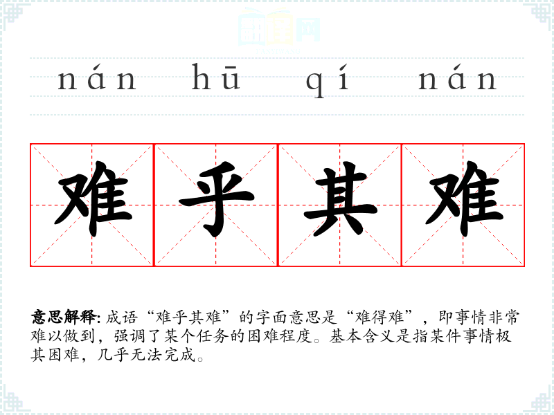 成语“难乎其难”的字面意思是“难得难”,即事情非常难以做到,强调了某个任务的困难程度。基本含义是指某件事情极其困难,几乎无法完成。