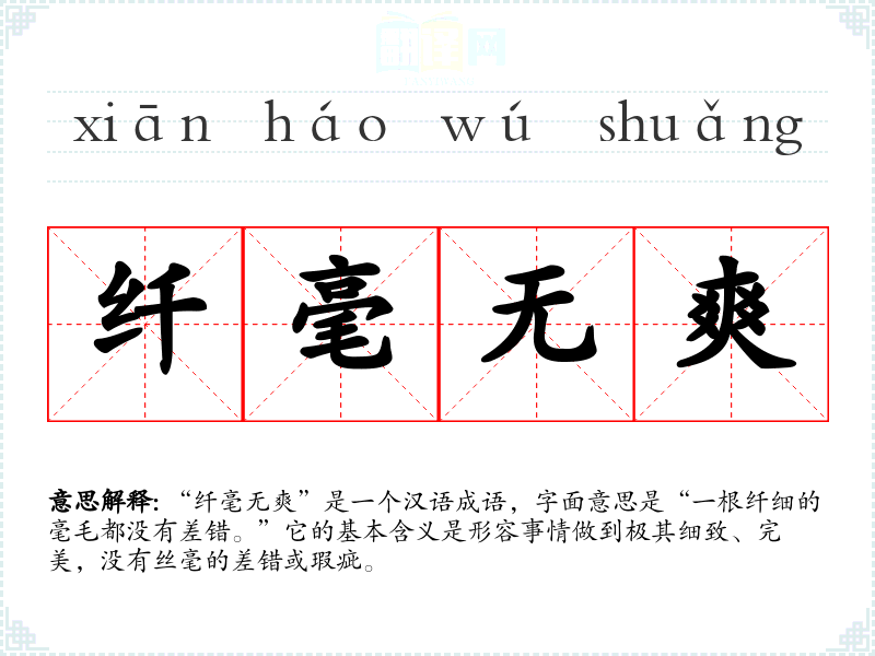 | 纤毫无爽 | 纤毫:细小的毫毛;爽:差错。极细微的地方也没有差错。比喻一点差错都没有。 |