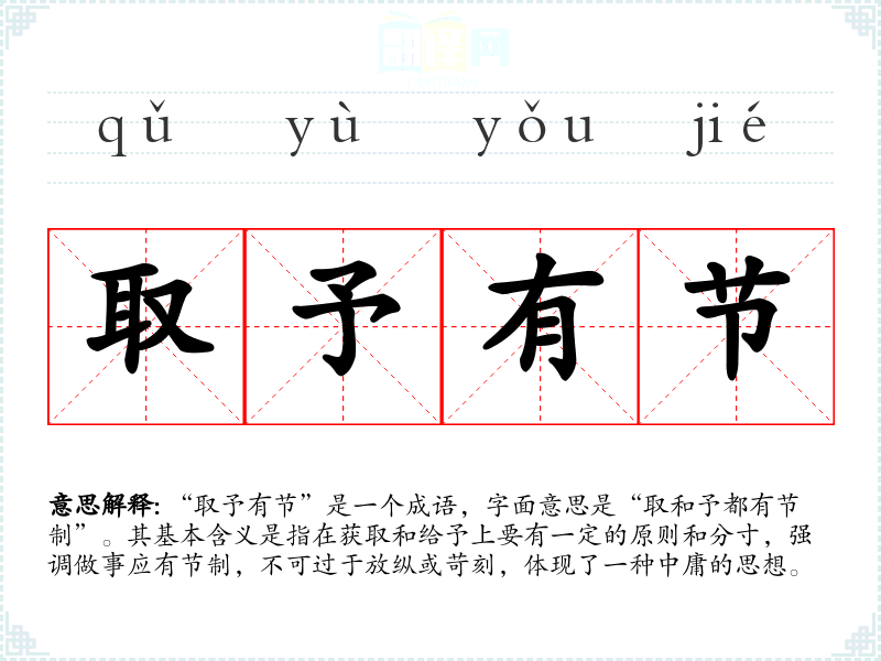 “取予有节”是一个成语,字面意思是“取和予都有节制”。其基本含义是指在获取和给予上要有一定的原则和分寸,强调做事应有节制,不可过于放纵或苛刻,体现了一种中庸的思想。