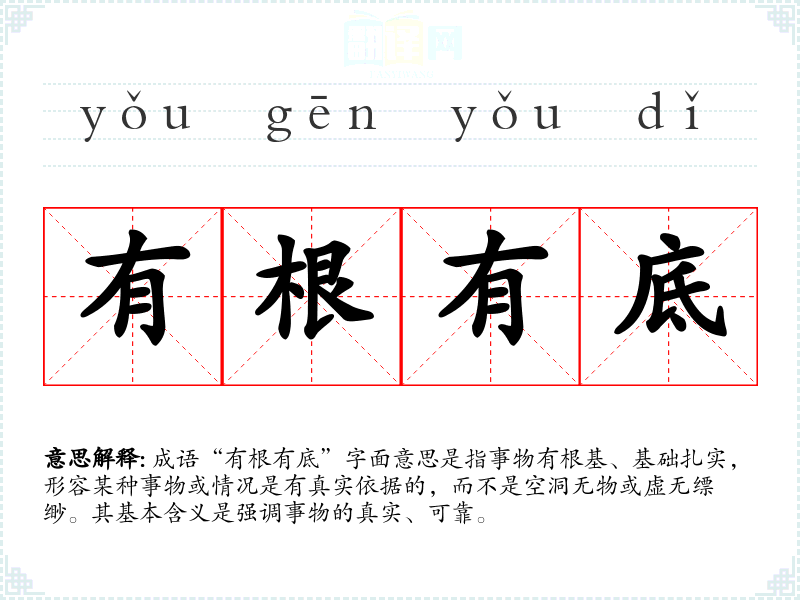 成语“有根有底”字面意思是指事物有根基、基础扎实,形容某种事物或情况是有真实依据的,而不是空洞无物或虚无缥缈。其基本含义是强调事物的真实、可靠。